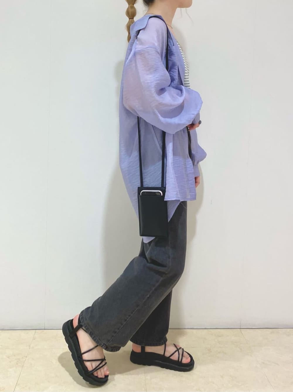パープルのシアーシャツで冷感夏コーデにしました♪ ◆シアーシャツは透け過ぎず、程よい透け感がポイントです!タンクトップに羽織っても露出感を抑えてくれます◎ゆったりとしたシルエットなので、抜き襟で着ていただくとさらにこなれ感がでます♡ ◆カラーボーダーのタンクトップはシアーシャツとの相性抜群です♪細めのボーダーなので女性らしく着ていただけます♡ ◆パンツは着回し力抜群のストレートデニムです!ハイウエストでスッキリした作りのパンツなのでカジュアルながらも綺麗めな印象にしてくれます♪ ◆スマホショルダーはシンプルで合わせやすいデザイン!さらに、裏面にはファスナー付きポケットとカードケースまで付いていてとっても機能的です♪ 154cm