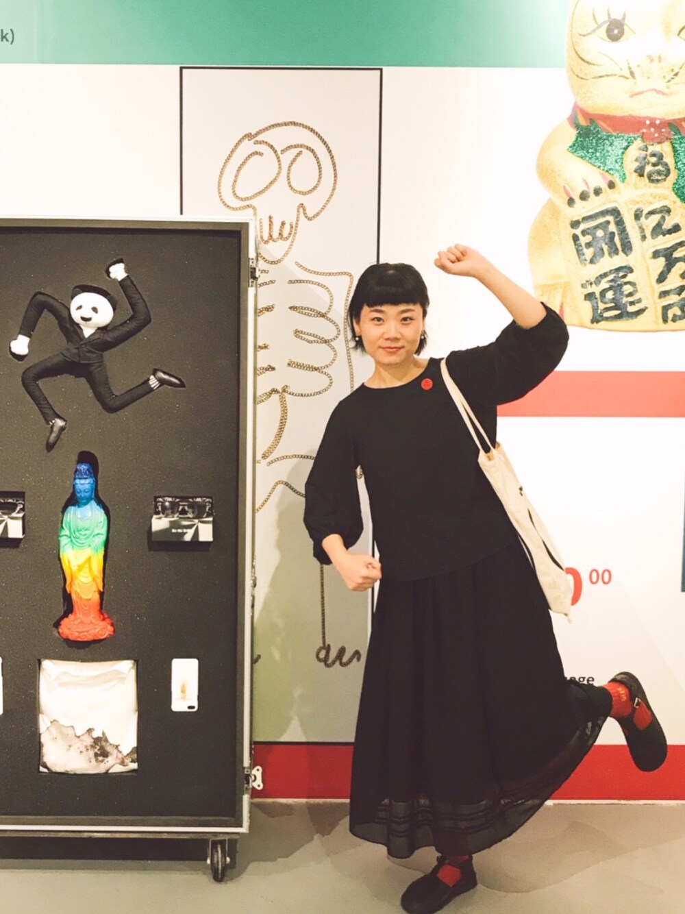 一身黑+白色布包