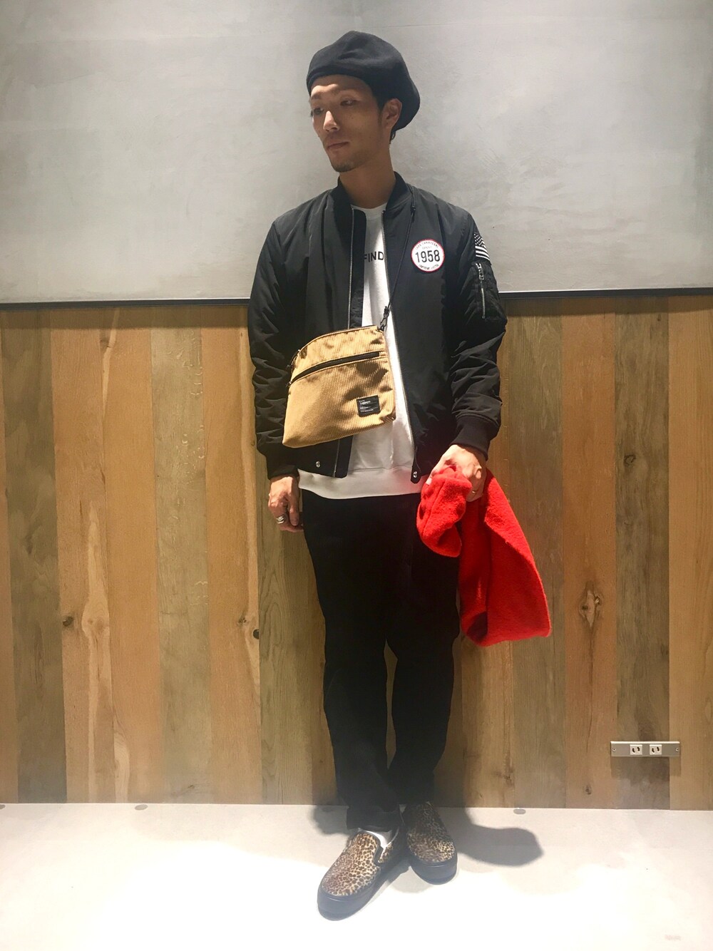 今回は柄、素材モノを多めに。 ワッペン付きMA-1でいつものMA-1に一癖プラス。 全体的にブラックまとめなので色映えする小物をチョイスしてます。 コーデュロイ、レオパードをさりげなく。