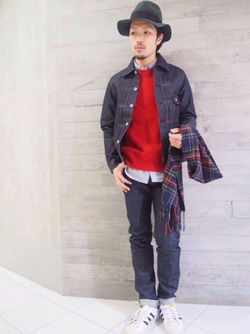 デニムのセットアップにはパンチの効いたカラーニットをいれて、メリハリをつけました。