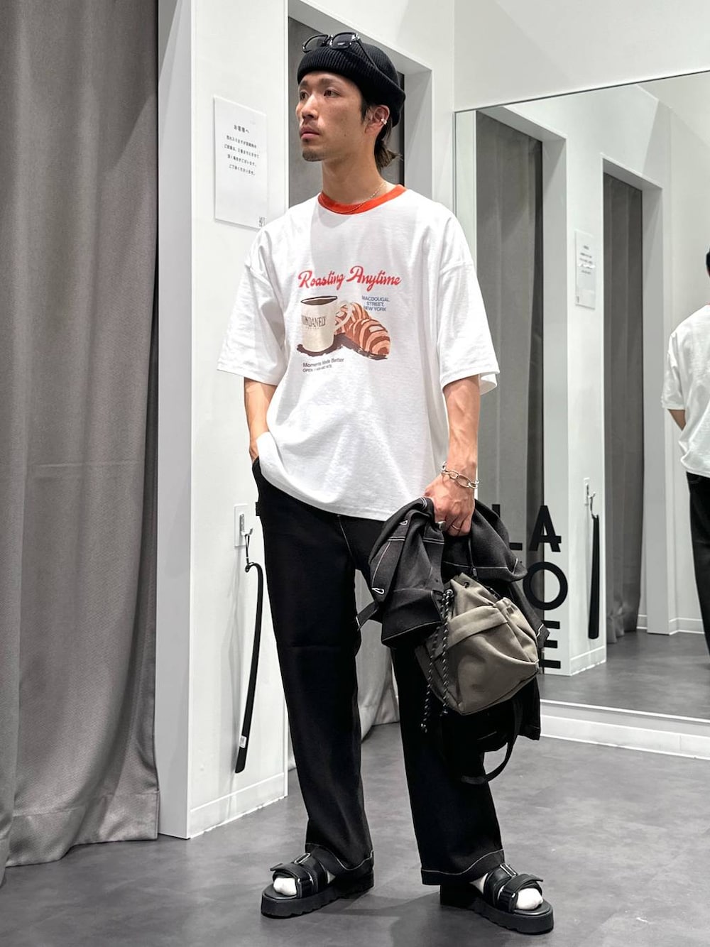 夏に向けてデザインTシャツお探しの方も多いのではないでしょうか! 今回おすすめなのがリンガーT👏 キャッチーなデザインとゆるっと着れるサイズ感がおすすめです! シンプルなモノトーンベースにスタイリングしてみました👍 【リンガーT】 サイズはややゆったり目で特に腰回りに余裕があります! ナシジ素材で表面に凹凸があり汗ばむ時期に着やすい作りが施されてます! 【ボトム】 セットアップでも着用可能な商品ですが今回はボトムを紹介👏 ワイドなシルエットですが足元はスマートにまとまるデザインですので太すぎて着にくい印象は無かったです! ぜひ商品ページもご覧ください👍 【サンダル】 ベルトでの調整がしやすく脱げる心配はなさそうです! ソールがやや新品だと硬さが残るので履き慣れるまで少し時間は必要かと思います! 歩いていて痛さは感じなかったので履きやすいサンダルでした! イヤーカフはウィメンズの物です! ゴツメなデザインが個人的に好みでした👍 スタッフ情報はこちらを参考に⬇︎⬇︎ 173㎝/60kg ウエスト75㎝前後 シューズ26.5㎝ 『この着こなしいいな』と思える投稿を増やしフォローいただけるように頑張ります👏👏