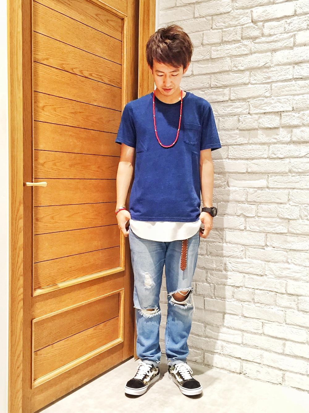 みなさんこんにちは! 少し前にVANS OLDSKOOL のカモ柄を買ってヘビロテしてるだっちょでこざいます。 あっという間に6月も終わり7月ですね! 最近は雨ばっかりで嫌になっちゃいますが、もうすぐ待ちに待った夏がやって来ますね! みなさんはもう夏の予定などはありますか?*\(^o^)/* そんな本日のスタイリングはインディゴTにダメージデニムを合わせて隠れデニム on デニムです! こちらのインディゴTは風合いがあり一枚で着てもインナーで着ても様になっちゃいます! ブルーとネイビーで無地とボーダー、クルーネックとVネック、と種類が豊富でございます! これだけで夏らしさ満開です! ショーツと合わせちゃっても◎ですね! 今日も楽しみましょう!! いぇあ!