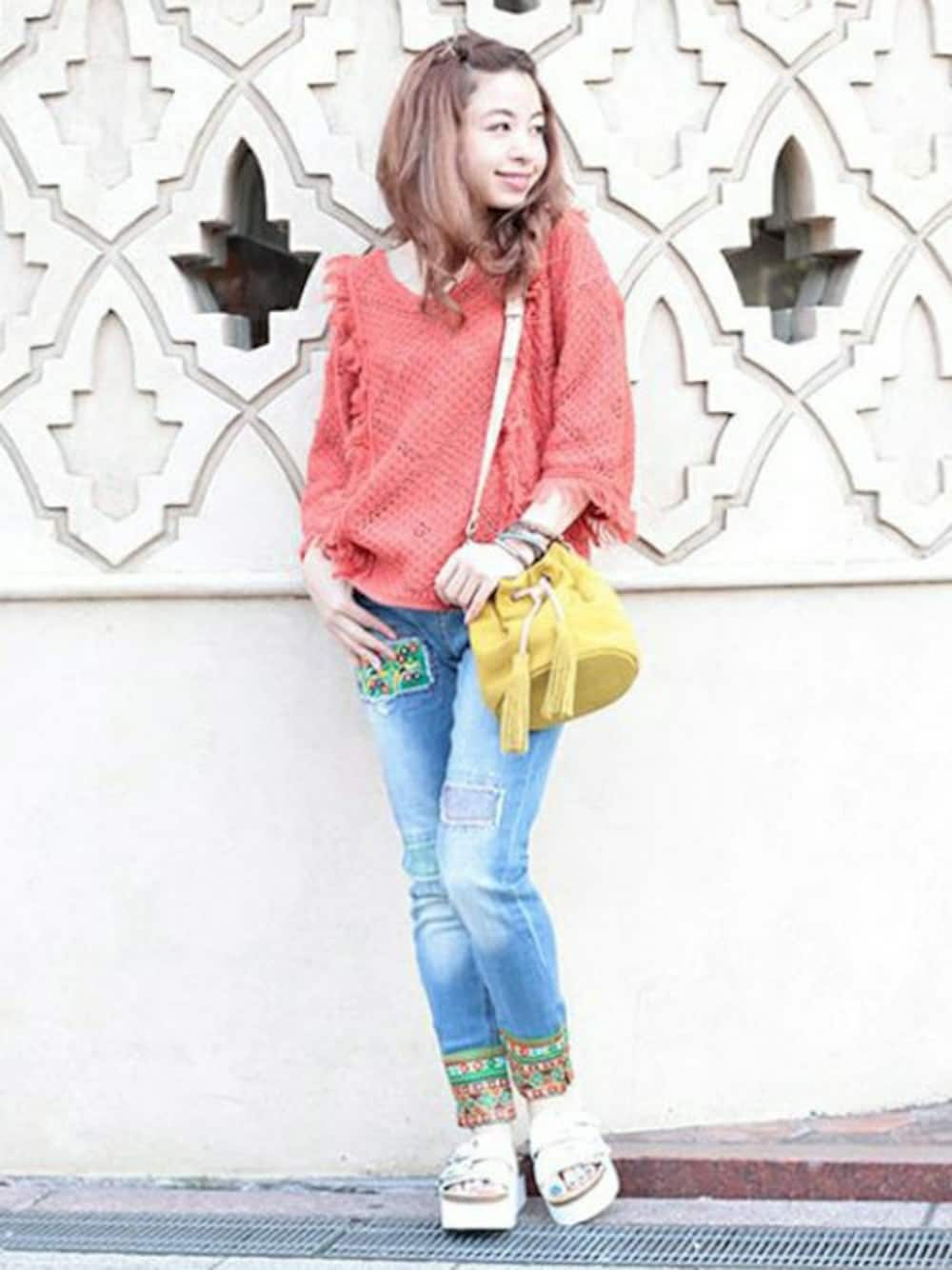 スペイン発のブランド、Desigualのデニムパンツは個性的な刺繍が可愛いアイテム。情熱的なオレンジのサマーニットを合わせて明るい印象に。