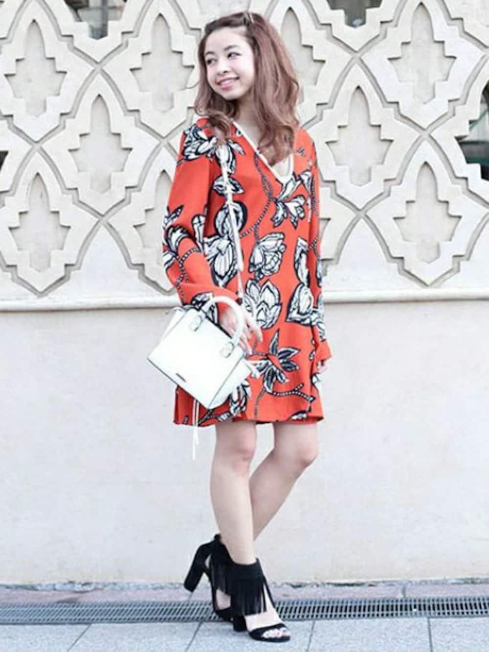 インパクト大な総柄ワンピースはオーストラリア発のブランド、FINDERS KEEPERSのもの。小物も同系色で合わせるのが統一感を出すポイント。
