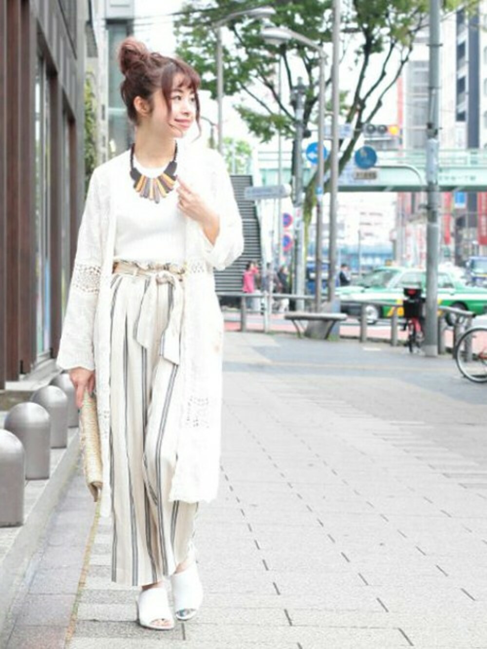 全身ベージュトーンでまとめた大人BOHOコーデ。レースのジレは軽い羽織が必要なこの季節におススメです。大きめのネックレスで首周りにポイントを作りました。