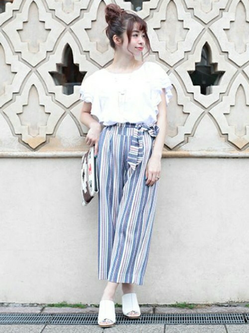 昨年も大人気だったSEEDS OF CALIFORNIA for ROSE BUDDのトップスは肩のフリルにボリュームがあるので、二の腕が細く見える効果あり。ストライプのパンツを合わせて爽やかなコーデにしました。