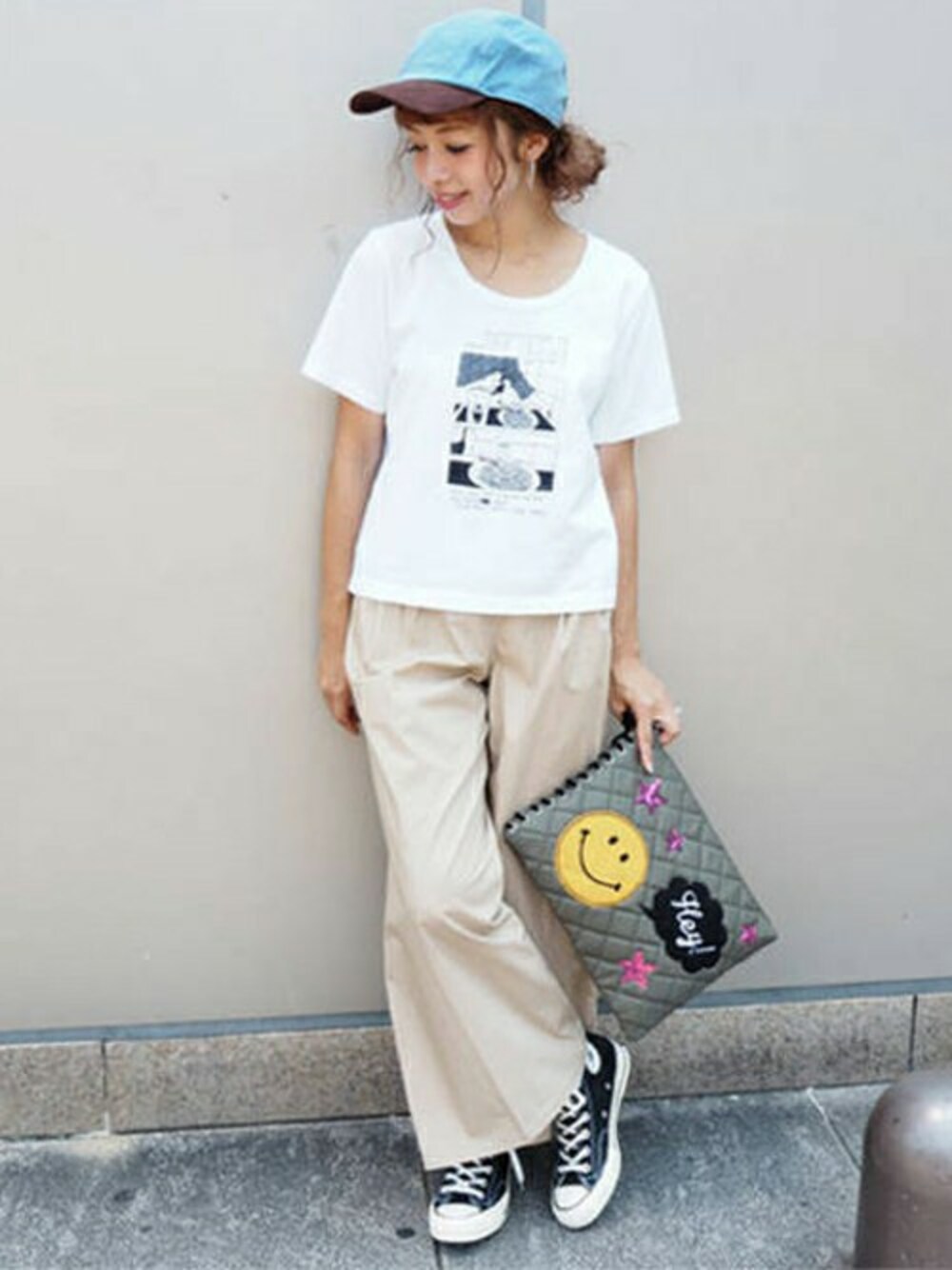 UNTITEというテーマのグラフィックが目を引くコーデ!どんなシチュエーションなのか想像してしまう彼特有のシュールな絵が魅力です!