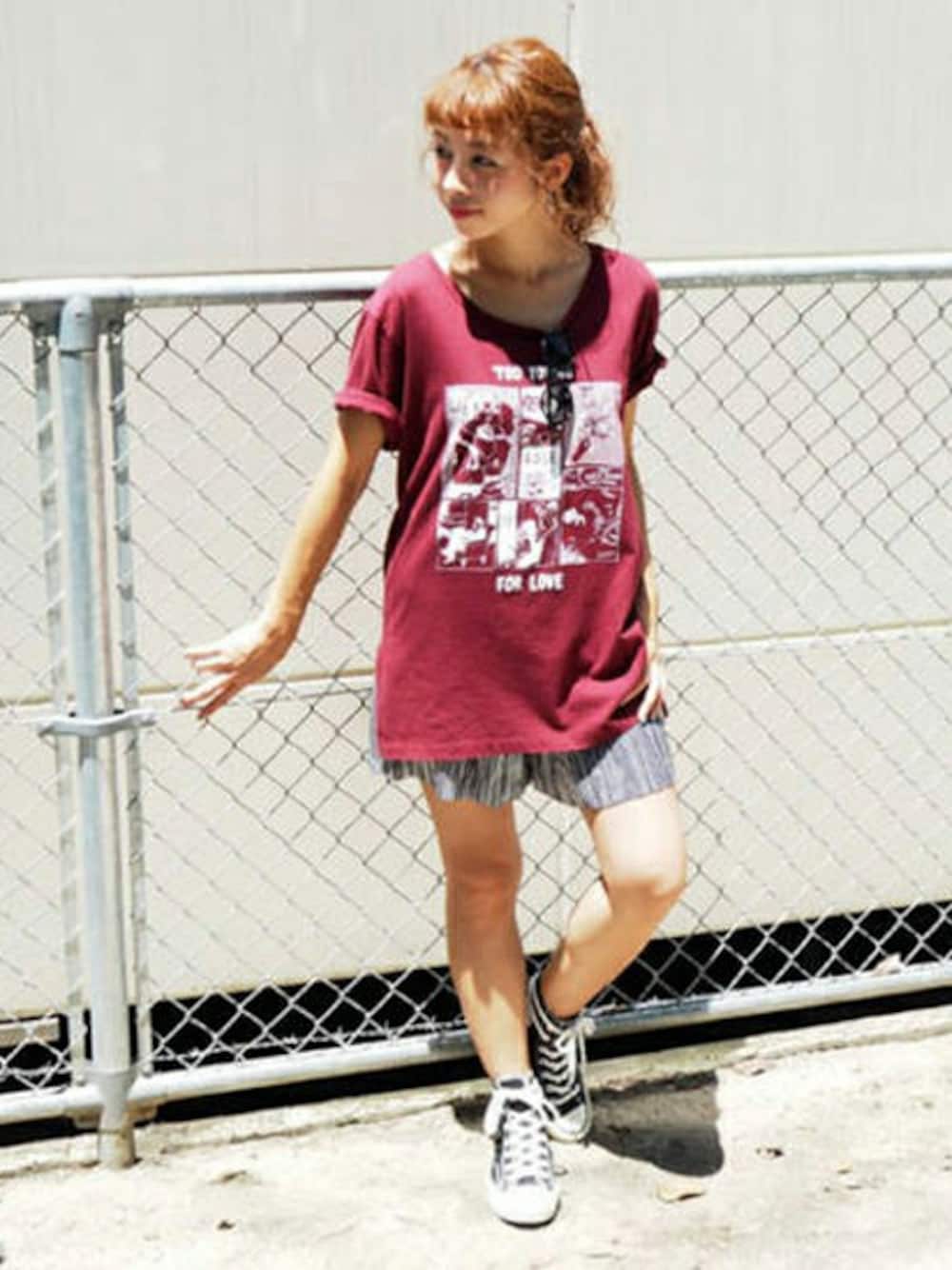 コラボTシャツのコーデ!コミック調のグラフィックにはROSE BUDにちなんでバラの絵を入れたキュートなTシャツは他とは差が付くアイテムです。
