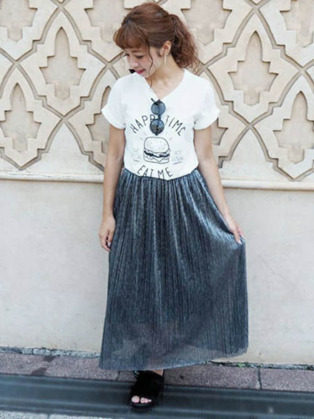 POPなハンバーガー柄を単色プリントで大人でも着られるコーデに仕上げました!晩夏ではサロペットやキャミワンピ・ワイドパンツ合わせもオススメです。