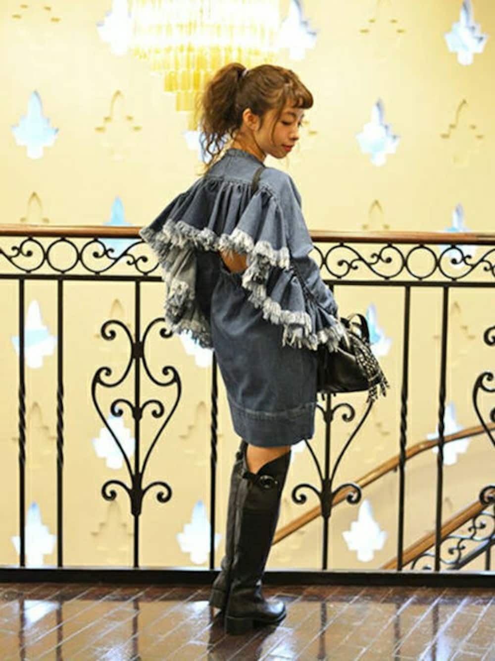 ストレッチの効いたデニム素材のワンピースは大胆な背中のデザインがポイント。レザーのニーハイブーツとスタッズ付きバッグを合わせて辛口な表情に。