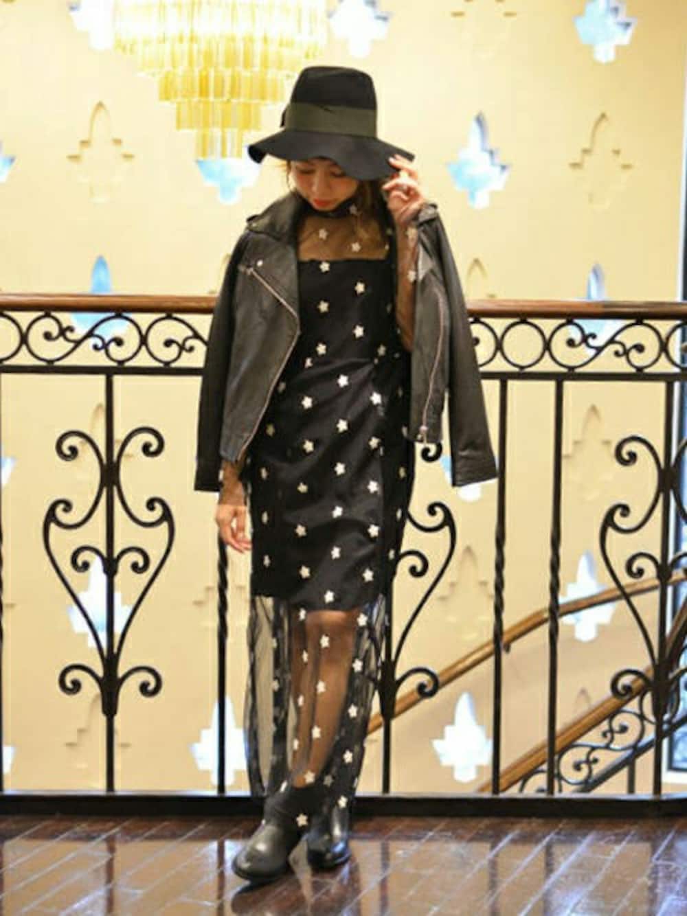 透け感x星柄がキュートなワンピースは年末に向けてのイベントにおすすめのアイテム。あえて綺麗めなパンプスではなく、ごつめのブーツやライダースなどハードなアイテムをプラスしたのがポイント。