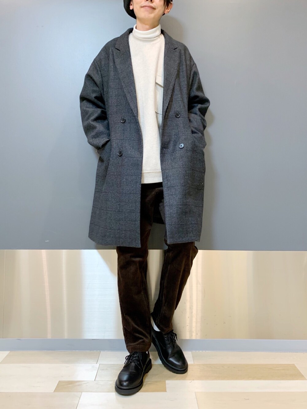 ヒロのチェスターコート「柄ジャージWチェスターコート/892384」を使ったコーディネート