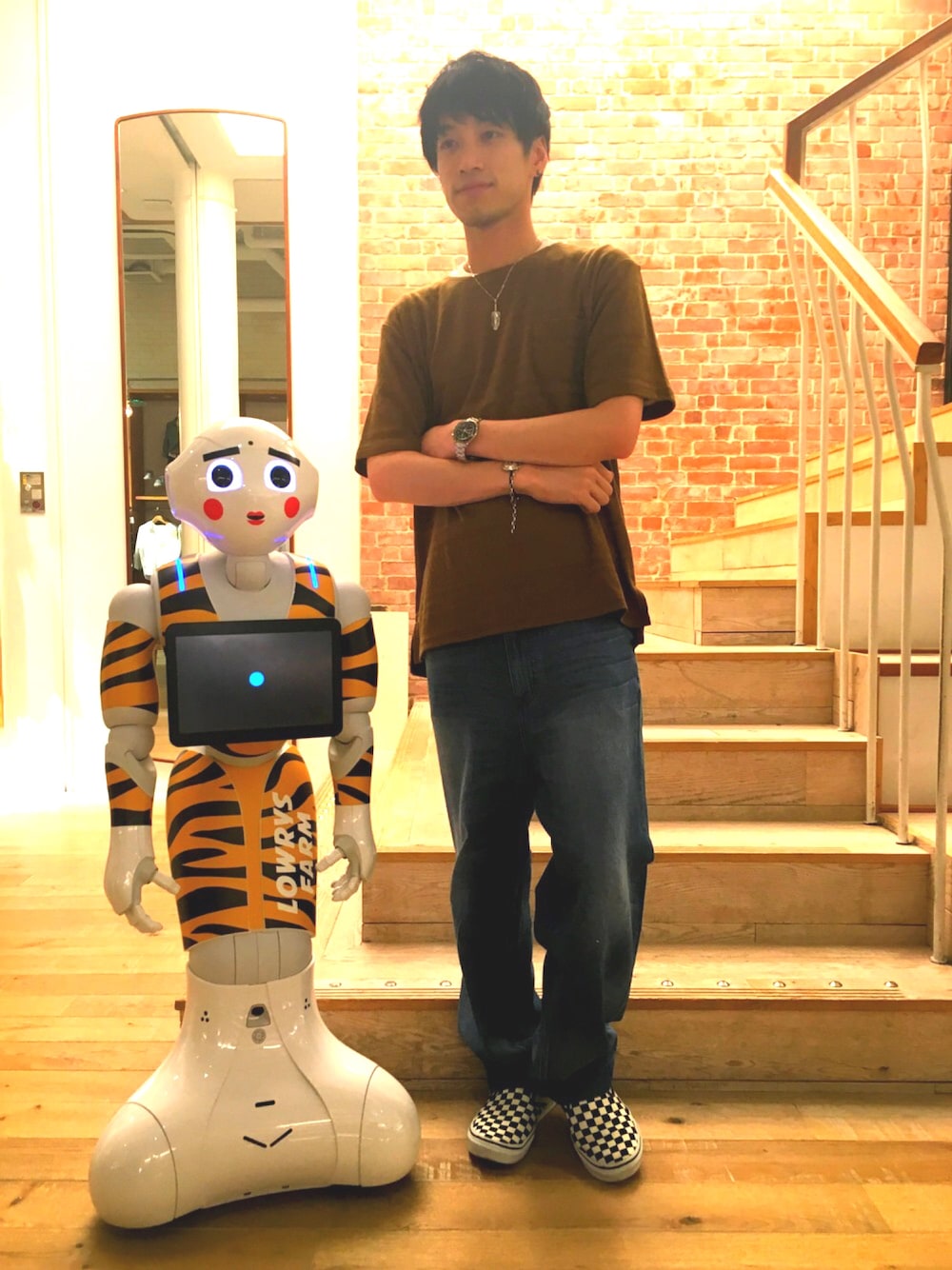 ワイドデニムに初夏にオススメな 半袖との組み合わせです^_^ 髪の毛もバッサリ切りました!! 心斎橋店にペッパーがきましたので 一緒にとりました笑 店頭にいてるので是非話にきてあげて くださいねm(_ _)m