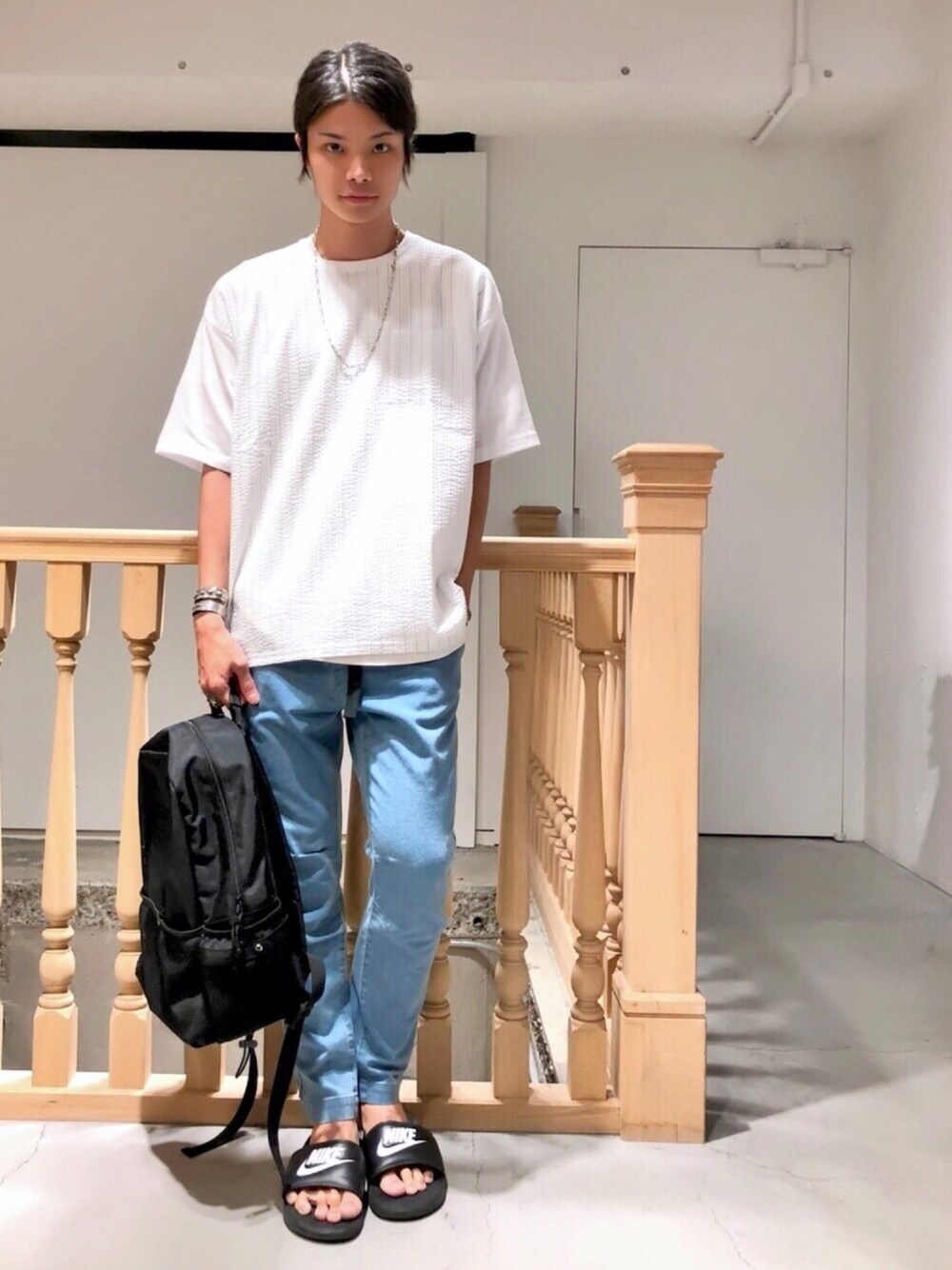 こんにちは! 今回はスポーティなコーディネートです! シンプルな着こなしですが、 トップスにシアサッカーの素材を使い アクセントにしています! 夏のコーディネートは シンプルになりがちですが、 素材やシルエットをアクセントに使ってみるのもおもしろいですよー! 是非参考にどうぞ!!