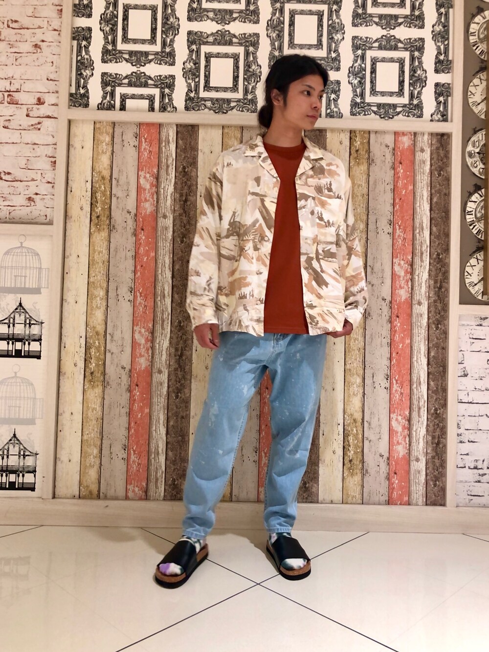 こんにちは! 今回はアフリカ柄のシャツをメインにした 春の大人カジュアルコーデです! インナーのさし色をコッパーカラーにしているのが、ポイントですよー! 是非参考にどうぞ!