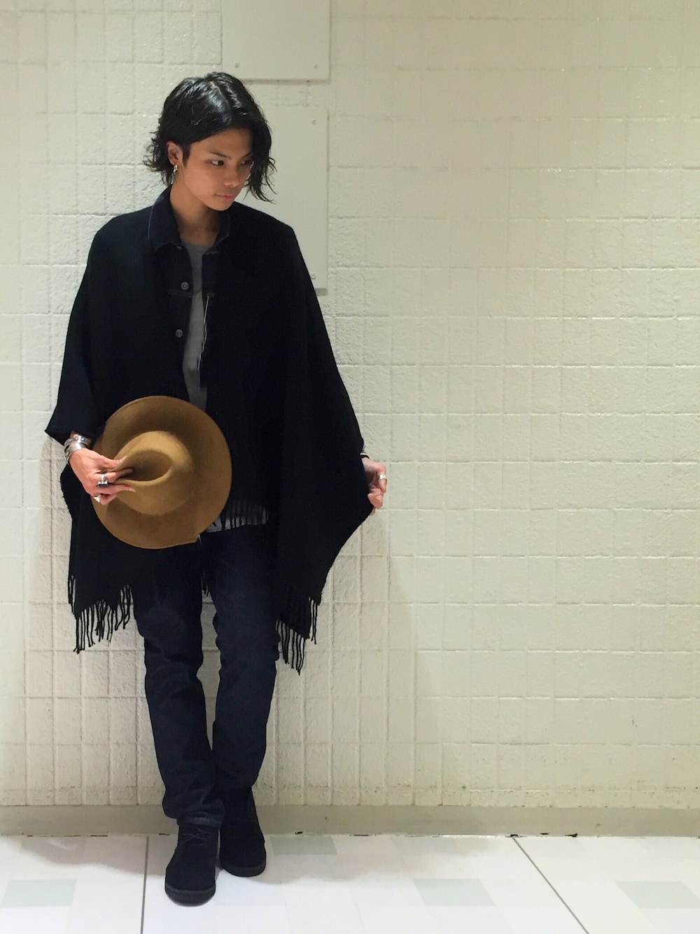 こんにちは! 今回はデニム✖️デニムのコーデです! セットアップ感覚でお楽しみいただけますので 全体のバランスが取れて、かっこいい印象間違いなしです!(^^) 肩からかけているポンチョは 今年らしいアイテムの1つなので 是非確かめてみてくださいね!(^o^)