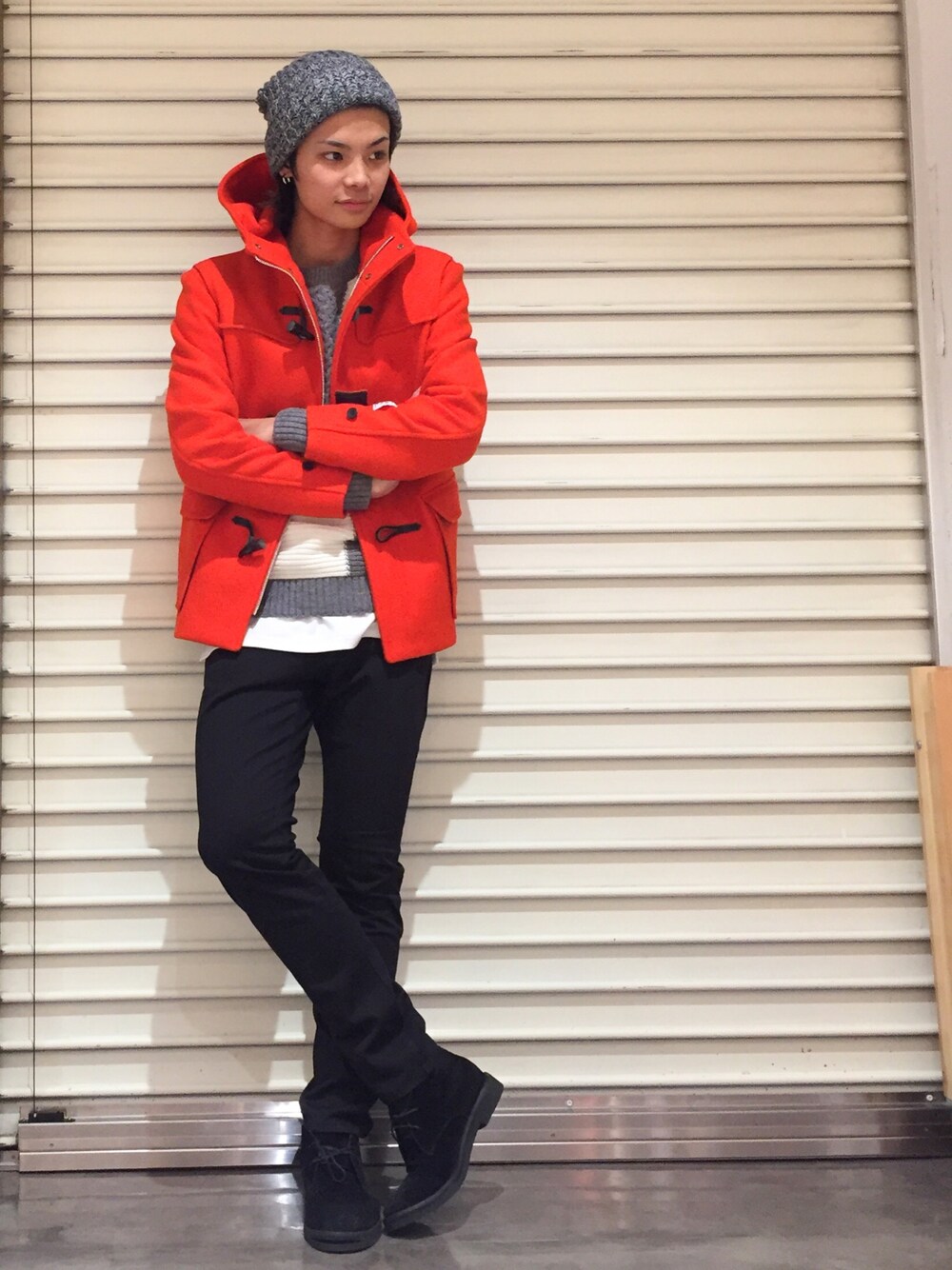 こんにちは! 今回は最近入荷したばかりの オレンジ色のダッフルコートを 着てみました! オレンジを主役にしますので その他のアイテムは白、グレー、黒で まとめるのがうまく着こなせるポイントですよー! 今年らしいアクセントの効いたアイテムになっておりますので 気になった方は是非試してみてくださいねー!