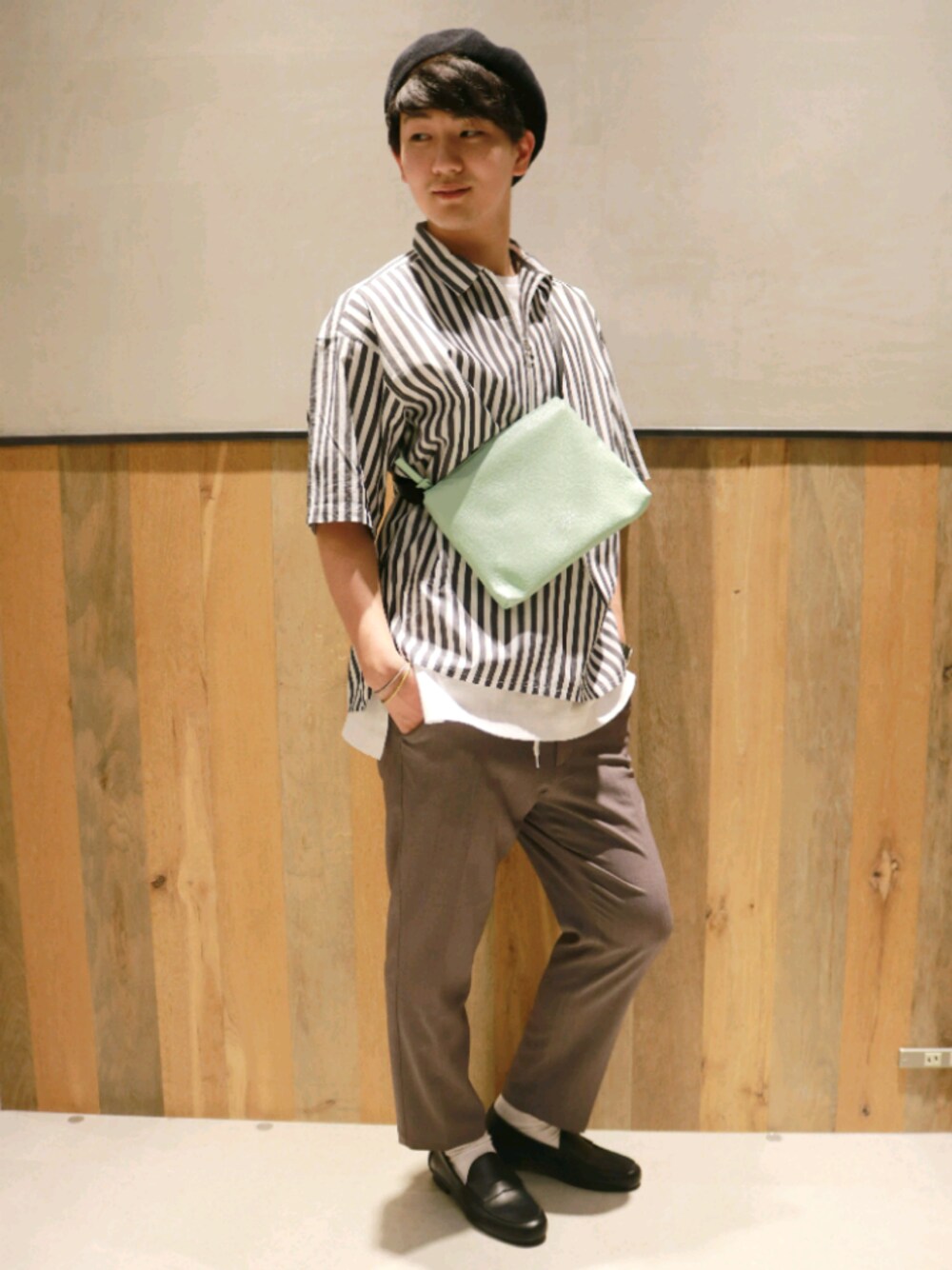こんにちは! 今日はトレンドのハーフジップシャツを使ったコーディネートです! トレンドのハーフジップシャツはスラックスや、レザーシューズでキレイさを強めてあげることで、ジップのユルさが目立ちます。 今回はモノトーンでよりシックな感じを演出してますが、あえてバックで差し色を入れることで、夏らしい爽やかさをプラスできますよ! 是非真似してくださいね☆