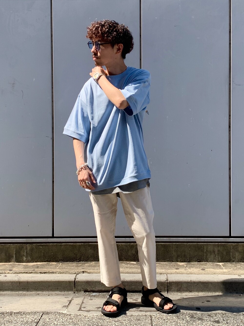 Instagram→@mochitaku_code ライトブルーのビッグTに白のイージーパンツで合わせた爽やかコーデ!