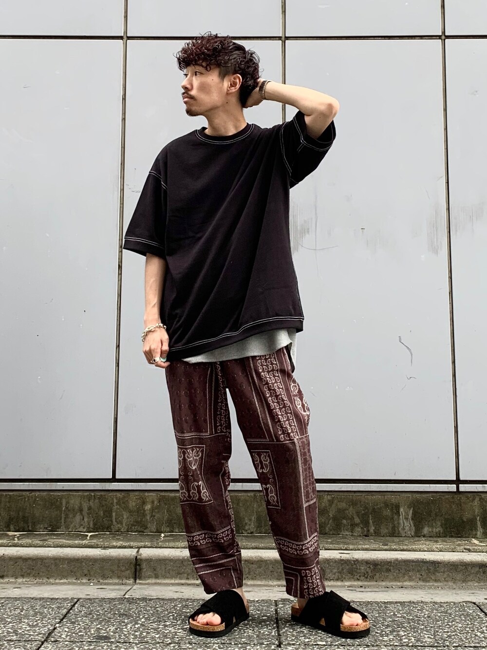 Instagram→@mochitaku_code 黒のビッグTに柄のイージーパンツを合わせたカジュアルコーデ! グレーのロングタンクでレイヤードしてます!