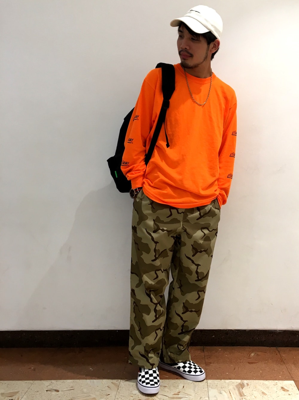 こんにちは! 夏も終わりに近づいているので少し先のご提案です! 思いっきりストリートにしてみました! 今の流行りの袖プリやチェッカーを散りばめ、ベージュのカモフラパンツで落とし込んでみました!! 今年は色物が凄く人気ですが、コーディネートに入れにくいと思います。 意外にもカモフラなどのアイテムが柄も入れつつ刺さりやすいのです! 是非恐れず色物や柄物を入れてみてください!!