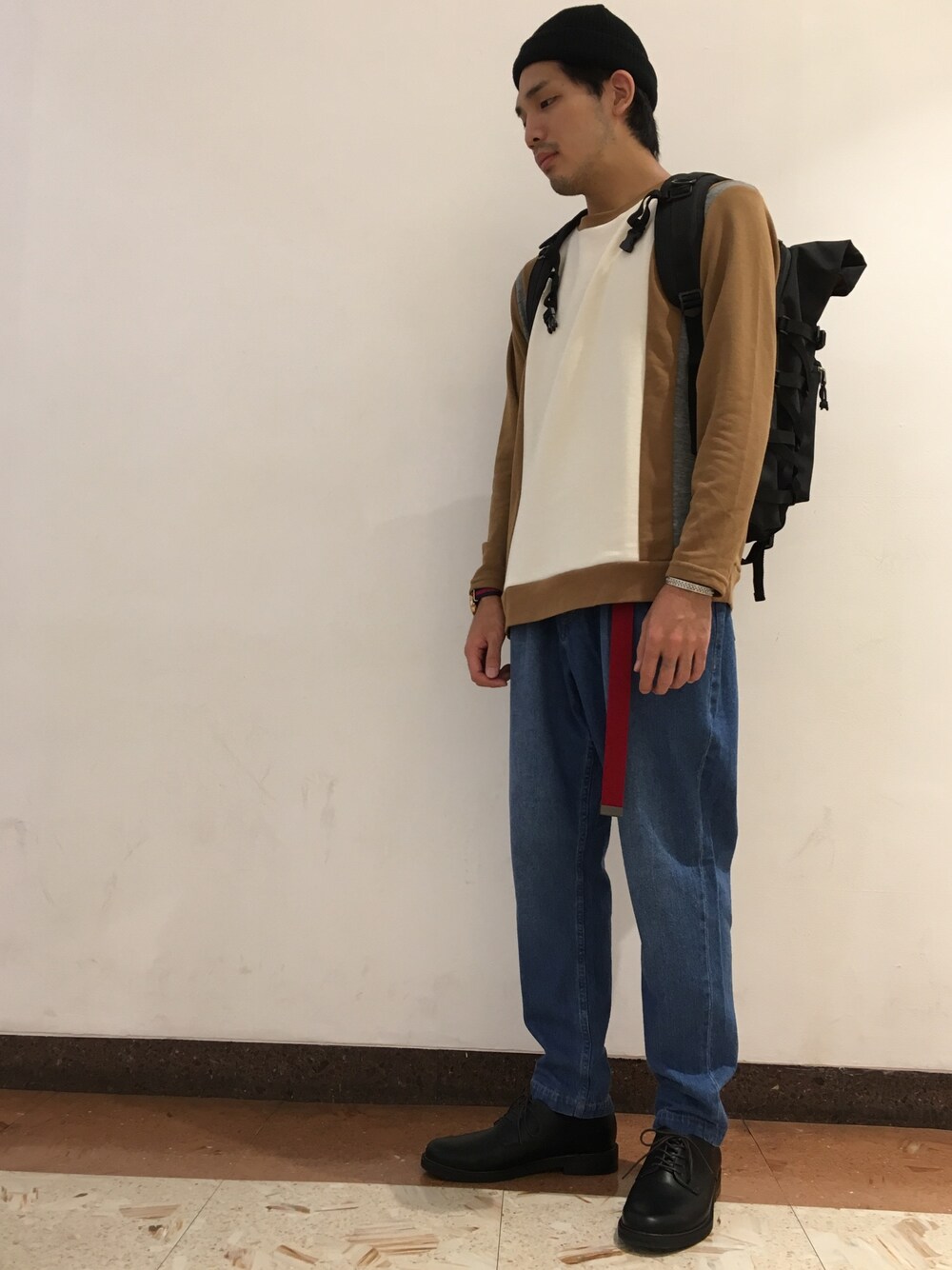 こんにちは!! 今回は秋のカラーをふんだんに使ってみました! ベージュとデニムの色の合わせだと少し落ち着き過ぎになるのですが、白い切り返しが大きく入っていると、明るくも見せられてバランスが取りやすいです! 色味が多くなる季節ですが、黒いアイテムを小物でもいいので何点か入れると、全体が締まったコーディネートになります! 是非、参考にしてみてください!!