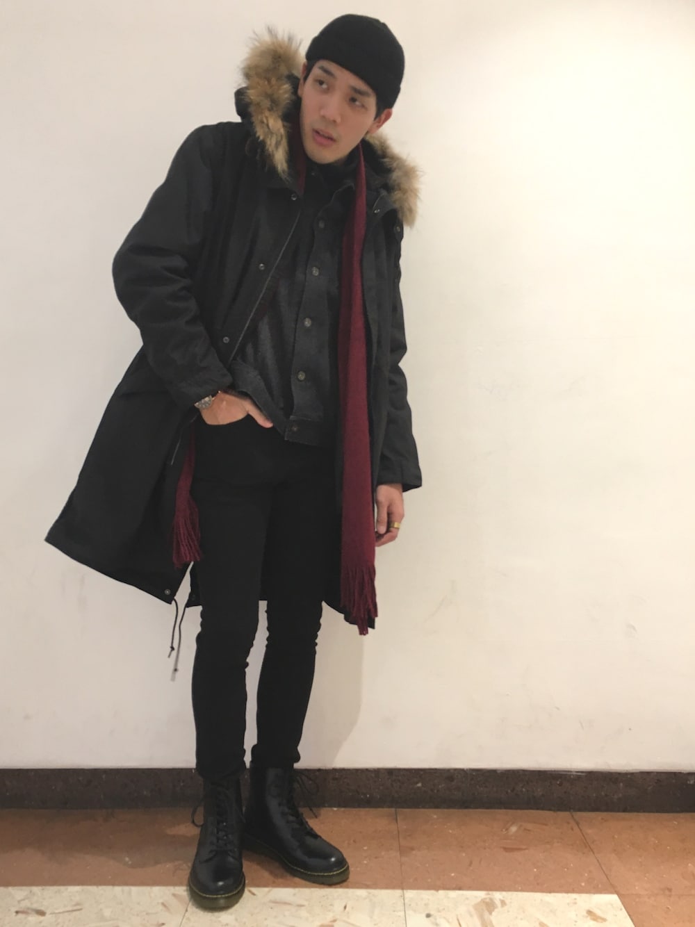 こんにちは! 今回のコーディネートは黒を基調にまとめ、季節ならではのブーツインやアウターオンアウターを取り入れてみました! 中に着せているものは薄手のデニムジャケットです。 秋物でも冬場に使えるとお得感がありますよね!笑 モッズコートもスッキリとしたデザインの為重ね着がしやすいです!! トップスにボリュームが出やすい季節だからこそスキニー等の細いパンツは綺麗に履けますね!! アウターオンにする時はスキニー合わせもおススメです! よければご参考にどうぞ!!