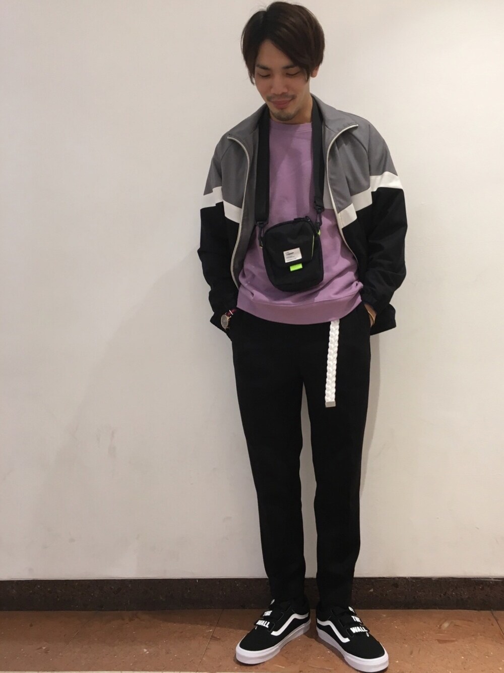 こんにちは! だいぶん久しぶりの投稿になります。 今回は素材感を合わせた「綺麗目×スポーツ」なコーディネートを組んでみました! スポーティな印象のジャケットをあえてスラックスで合わせて綺麗なイメージを出しています。 小物もカジュアルでまとめ、ジャケット本来の持ち味を引き立たせてみました! この合わせだと中のアイテムも選び放題なのでトレンドのパープルで刺してます! 是非この合わせをお試しいただければと思います!!