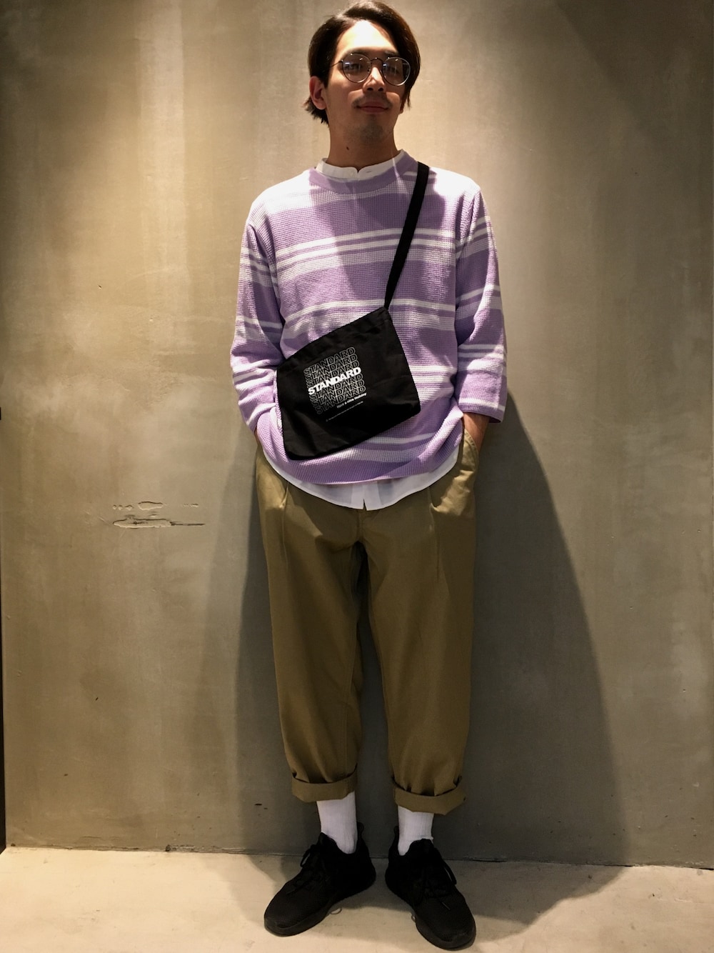 こんにちは! 相変わらず気温が安定しない春ですが皆様いかがお過ごしでしょうか。 私は関係なくヒノキの花粉にやられております。 さて、今回はトップスをシャツとニットできれい目にしつつ、パンツはワイドなチノで合わせてみました! シャツはバンドカラーで抜け感を出していて、バランスを取るべくスニーカーとサコッシュでストリート要素をプラスし、ワイドパンツを馴染ませています。 ワイドパンツもロールアップするだけで季節感がグッと増すのでパンツの形に関係なく上げていきましょう!! 是非ともご参考にして下さい!