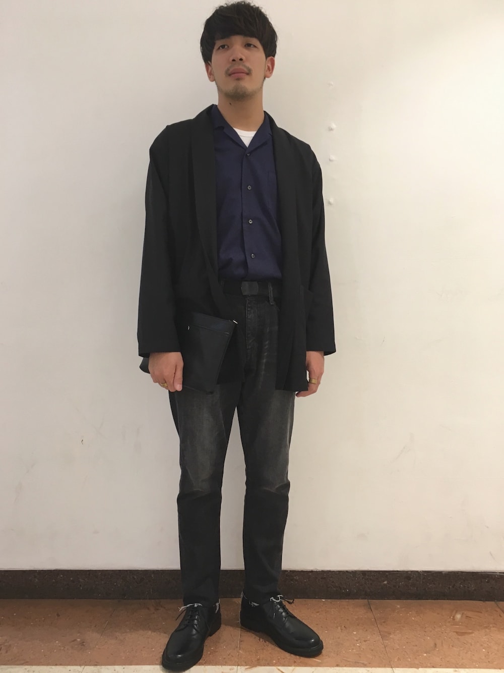 こんにちは!! 今回のスタイリングはモード軸で組んでみました!! ガチガチにならないようにカットオフデニムやチェック開襟シャツ(チェックが見え辛いですが)等のアイテムで組むことにより、抜け感を出しています。 ただ、セカンドバッグや靴を等を皮もので合わせる事により本来のモードらしさを出す事もできます! 世界観の違うアイテムでも工夫次第では合わせる事が出来るので、是非ご参考にしてみてください!