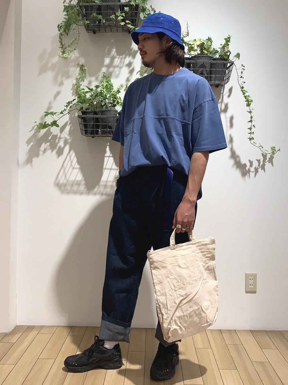 こんにちは!! 突然ですが 梅雨はやはりしんみりとしていいですね。 思い耽る今日この頃です。 今回のコーディネートは雨を意識したブルー統一コーデにしてみました! それぞれ生地感、トーンを変えて遊び爆発でございます! Tシャツ一枚でもタックインをするだけでコーディネートの表情が変わりますねえ。 遊び幅の少ない季節だからこそ是非試してみてください!!