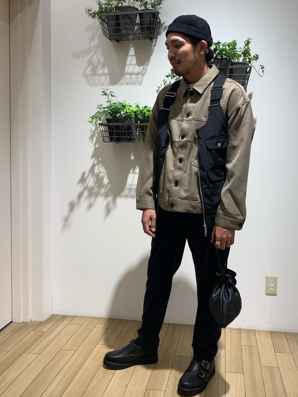 こんにちは!! 朝晩は冷える季節になりましたね。 温度差で身体を壊さないように皆様お気をつけ下さいませ! 今回はゴリゴリにワークのコーディネートにしてみました! 今風に仕上げる為、ステッチのジャケットの上からベストを着合わせて、個性も出してみました! 世の中キレイ目が多い中ワークやミリタリーで周りと差をつけてみては如何でしょうか!! 是非ご参考にしてみて下さい!!