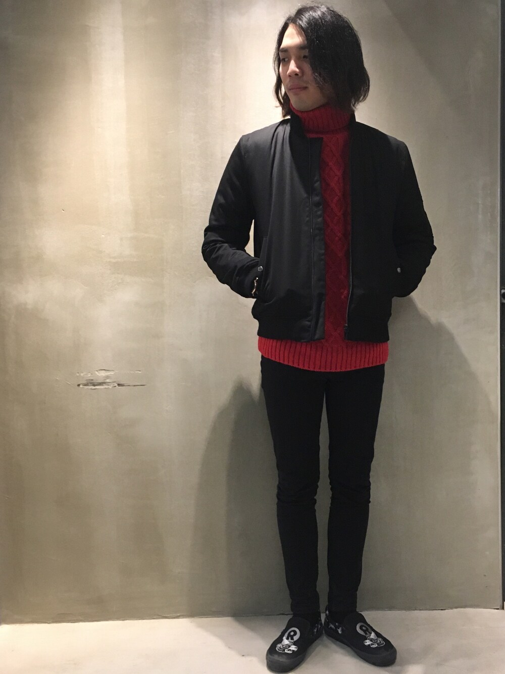 こんにちは!! 冬といえばニット! タートルネック! という事でかなり発色の強い赤のタートルネックを使ってみました。 色は可愛いのですが、馴染みにくい赤。 なのでオーソドックスに他を黒で固めてみました。 落ち着いたカラーが多くなりがちな季節なので、少し色の強めなアイテムを一つ入れてみると華やかになります。 ぜひともご参考にしてみて下さい。