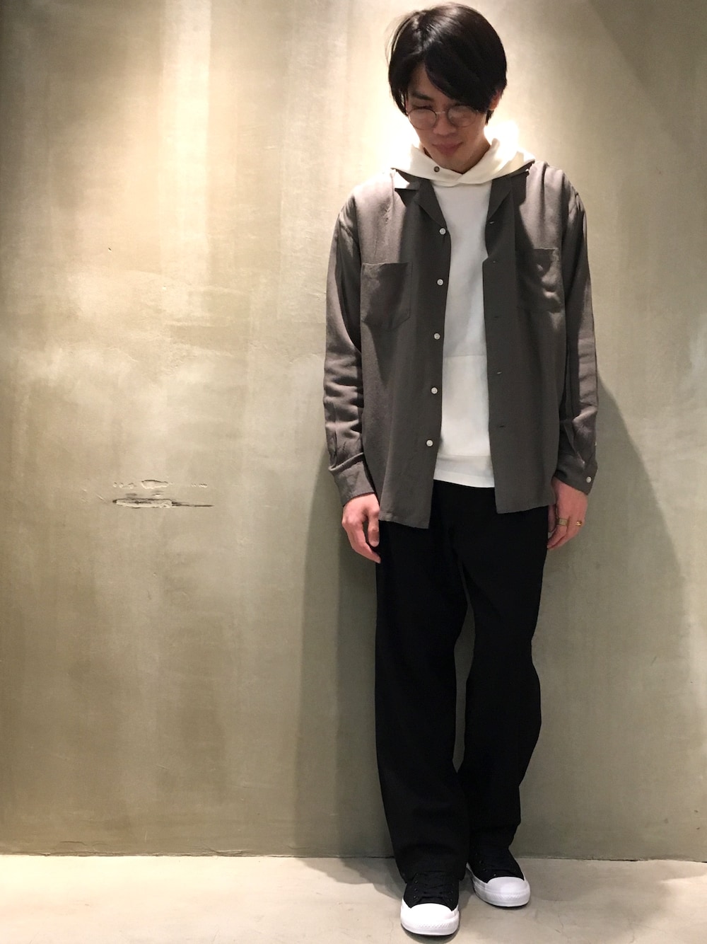 こんにちは! 今回はパーカーの上からオープンカラーのシャツを羽織って、清涼感のある感じにしてみました。 普通のシャツより涼しげな感じも出るので何にでも羽織ってみてもいいと思います! もちろん中はカットソーなど他のアイテムでもしっくり来ると思うので、是非ご参考にしてみてください!