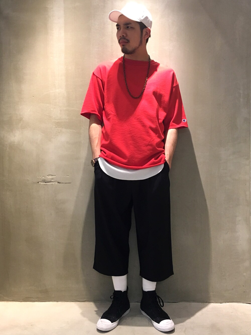 暑いですね! 今回はストリートな感じにして見ました! 全体的にルーズなシルエットにして夏っぽさを出しています! ガウチョはキレイ目で履くのもいいのですが、ガッツリとストリートにしてソックスで遊んでみるのも楽しいと思います! 是非ご参考にしてみてください!