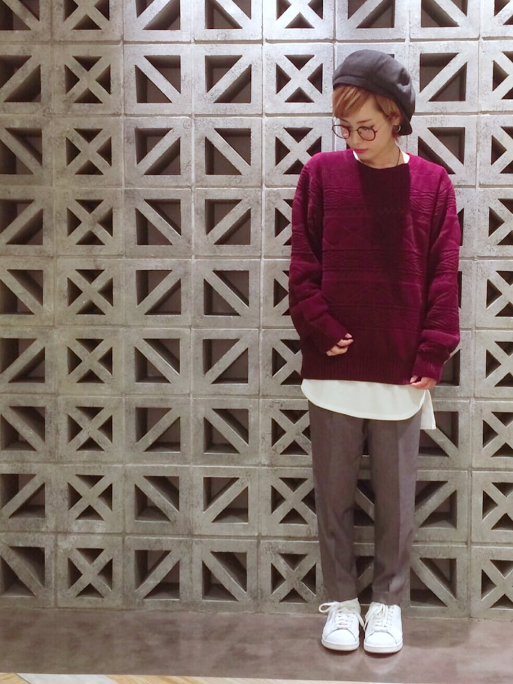 こんにちは!! 今回も、オールメンズでボーイッシュにまとめました。 でもメンズアイテムだと自然と ゆったりシルエットになるので、 女性らしさもどことなく出ますよね。 着用しているのは、 ★リンクスジャガードニット →ワインレッド / Mサイズ ★ワッフルドロップカットソー →ホワイト / Lサイズ ★TWテーパードパンツ →グレー / Sサイズ ★ウールキャスケット →グレー / フリーサイズ ★コンビボストンメガネ →ブラウン です! 読書でもしてそうな、秋コーデになりました! パンツとキャスケット、レイヤーとスニーカーで色を合わせる事で統一感がでますよ〜! ぜひ、お試しあれ!!!
