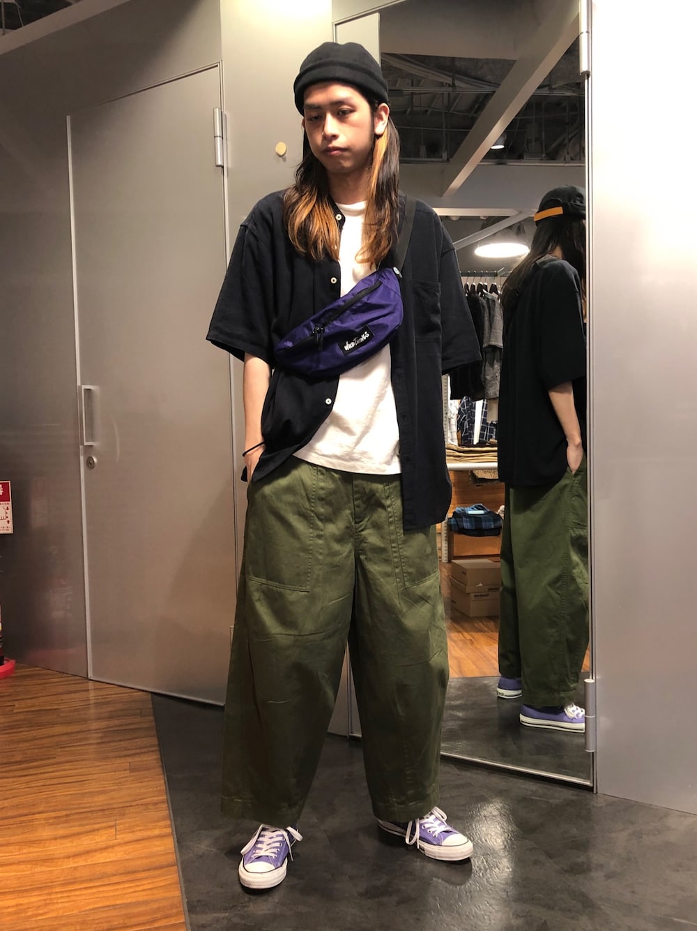 いつもご覧いただきありがとうございます! レイジブルーキャナルシティ博多店の藤瀬です。 今回は雰囲気重視のストリートコーディネートにしてみました! ベーカーパンツとバンドカラーシャツで全体的なシルエットに変化をつけ、小物に紫を使うことでとても印象的になります! 個性的なアイテムではありますがシンプルにTシャツに合わせるだけでも問題ないので着回しにも抜群です! よかったら参考にしてみてください!