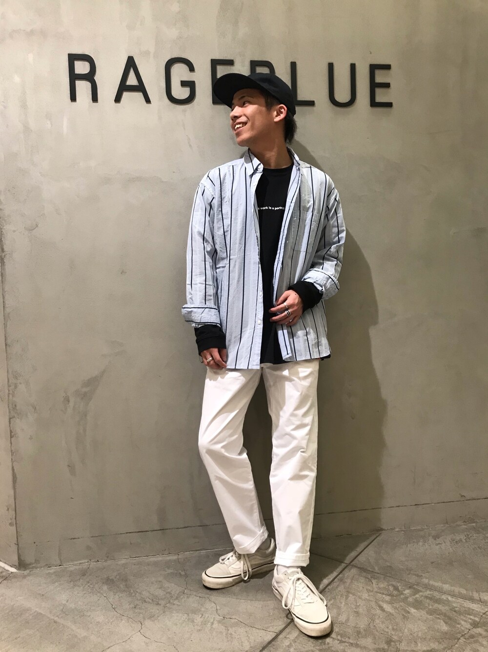 皆さんこんにちは! 今回は色味を春らしさ、爽やかさをイメージし、仕上げました! ストライプシャツにワンポイントにプリントロゴのアイテムを合わせ、全体の色味が明るいので、ロゴTは黒で抑え、落ちつきのあるスタイリングにしました! 是非皆さんも参考にしてみてはいかがでしょうか!!