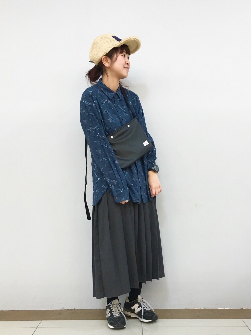 シャツのブルーと帽子のキャメル色がコーディネートのポイントとなるようにシンプルにまとめました! 今年人気のスプラッシュ柄やボア素材を取り入れて、冬のおすすめコーディネートです! 女性の方にもオススメです◎ ぜひお試しください(^^)