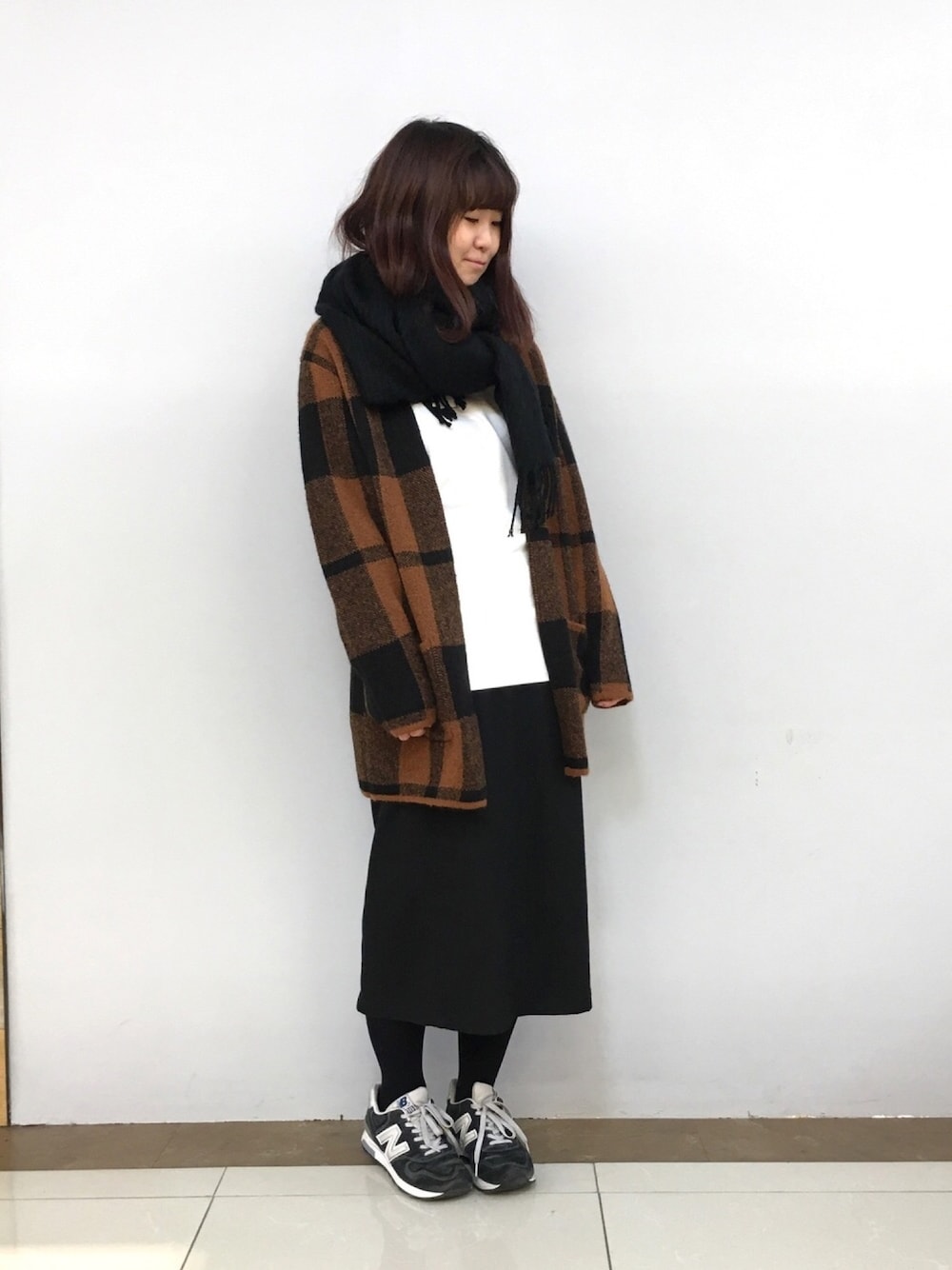 カーディガンのチェック柄がコーディネートのポイントになるように、 他をモノトーン調の色で纏めました。 チェックの色と小物の色を合わせると統一感が出てオススメです! マフラーは大判サイズで首にぐるぐる巻きにしボリューム感を出しました! ぜひお試しください!