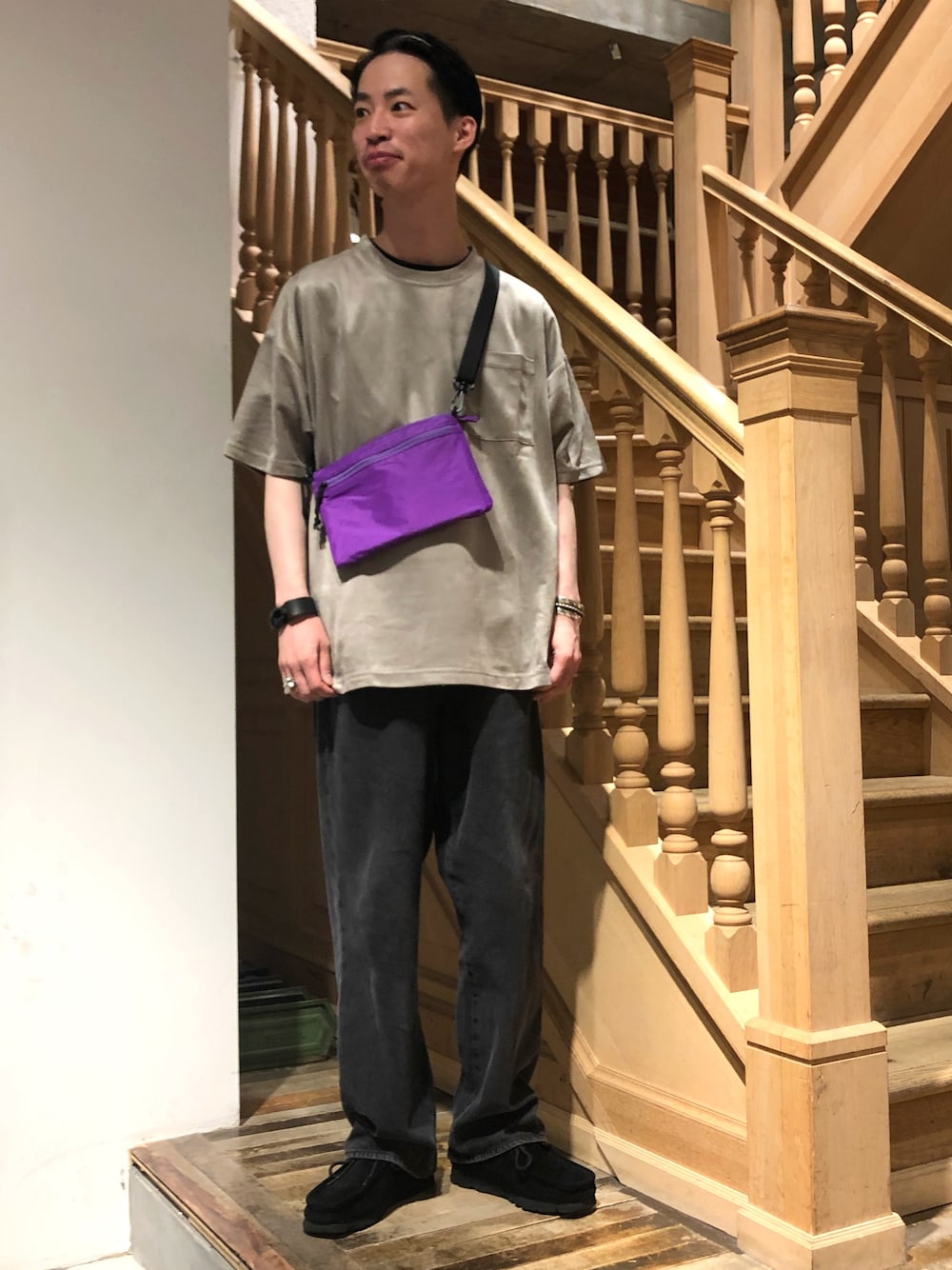 光沢感がある上品なトップスをカジュアルに合わせてみました! きれいめはもちろんのこと、カジュアルに合わせてもかっこいいです。 サコッシュで色のアクセントも! ぜひ店頭でご覧ください!