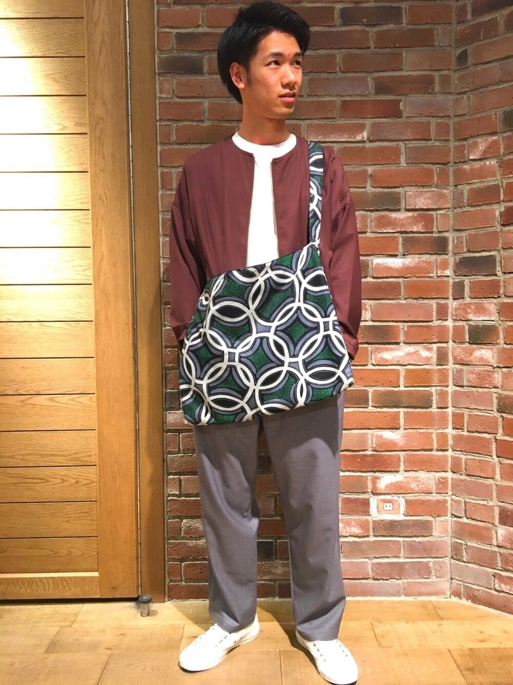 ノーカラーのジャケットにグレーのワイドパンツをあわせ、キレイめカジュアルスタイル☆ 今年らしく、インナーをタックインしてみました。 柄のバッグがコーディネートのポイントです。