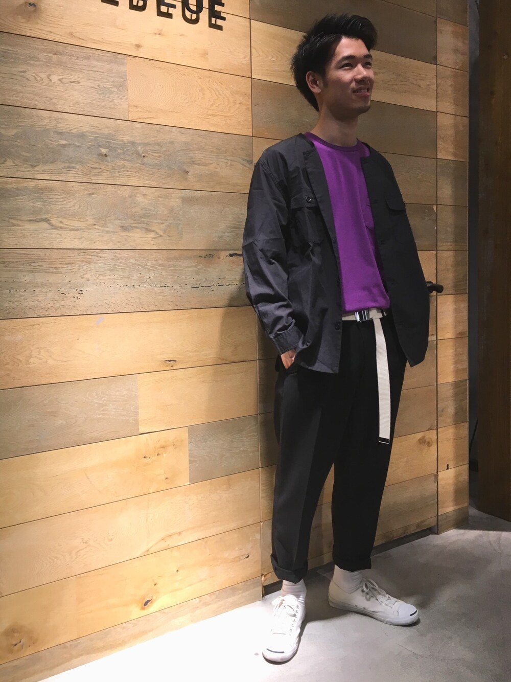 春ですが… あえて黒で統一し、紫をメインカラーに持ってきました。 靴を白にする事で暗くなり過ぎずコーデしました。