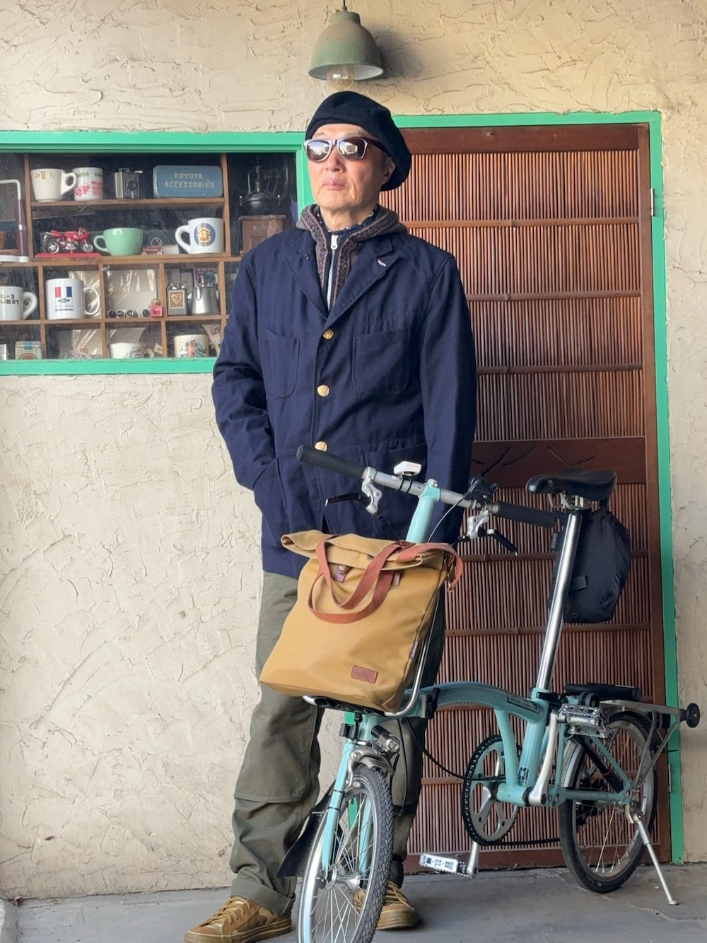 ガーメントの定番ベッドフォードウールサージのジャケットだけでは寒いので、中にTKのフードセーターを着ました😁 下は、何故か廃盤になったパタゴニアのダブルニーのクライミングパンツ。 ブロのバッグを何でも使える色目の小ぶりのモノトーンに😊
