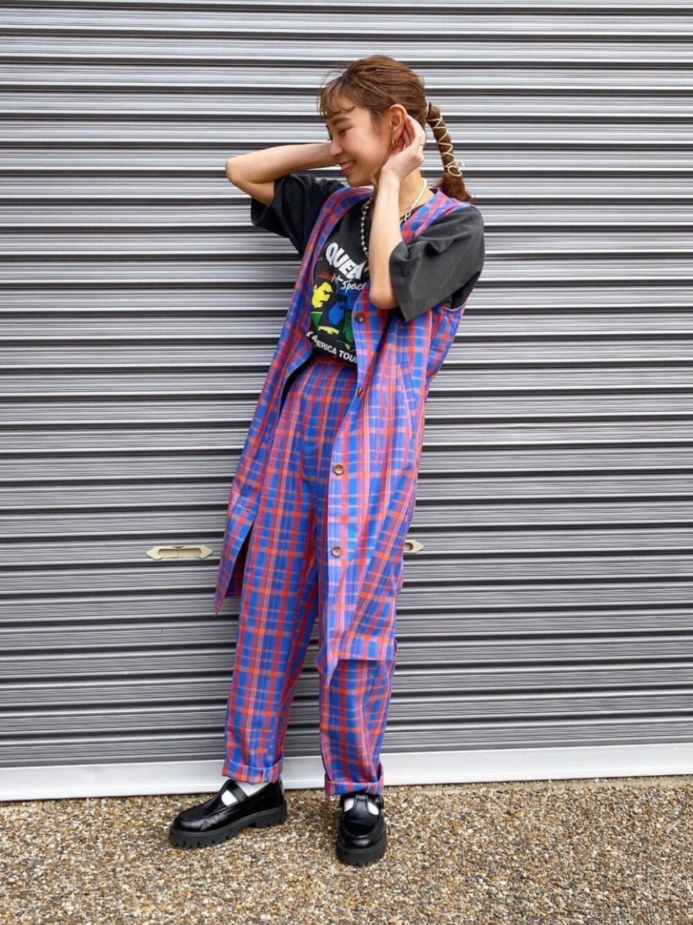 チェックのロングジレ×パンツのセットアップコーデ✨ バンドTにぴったりな組み合わせ♡ 明るいカラーが気分も上げてくれます😊