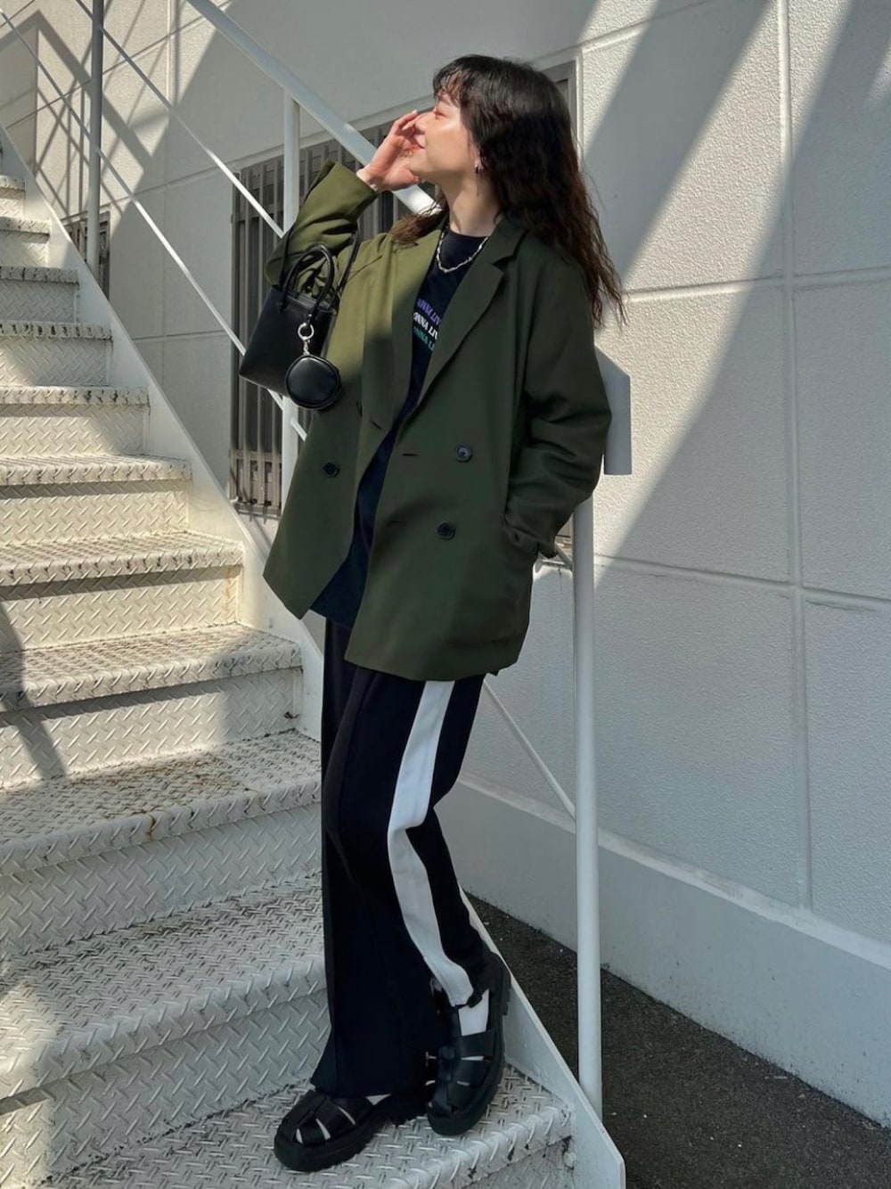 テーラードジャケットにあえてトラックパンツを合わせてリラックススタイル✨ ジャケットはゆったりめなので、カジュアルスタイルにも合わせやすいです♪