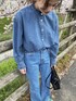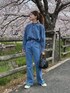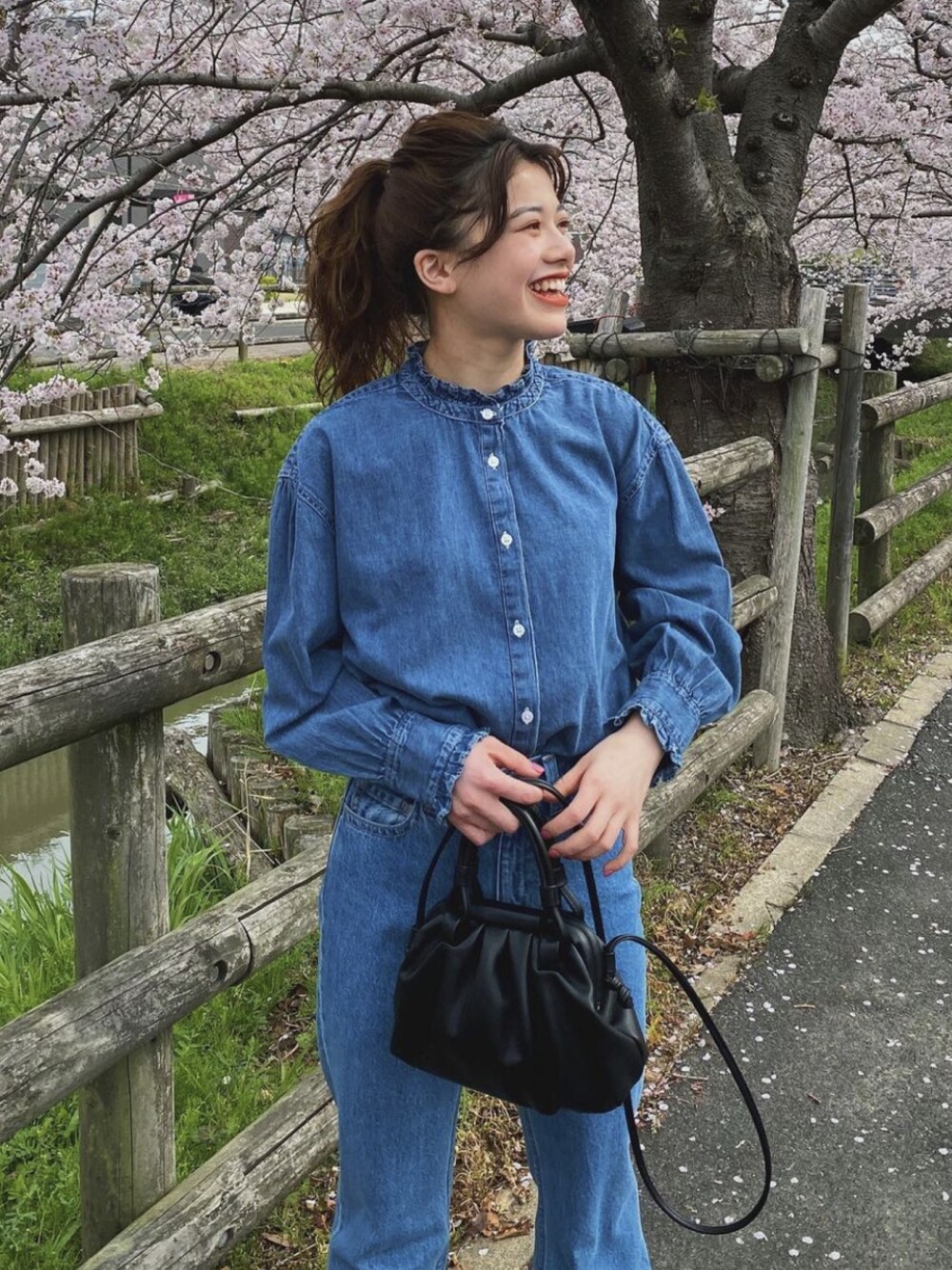 フリルが可愛いデニムシャツにデニムパンツを合わせてセットアップ風に👖 ポシェットは小さすぎずちょうど良いサイズ感👜✨
