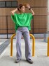 ゆるっとコーデ✨ 鮮やかなグリーンが映えるTシャツはバックの袖から肩にかけてのロゴが目立って可愛い💚 パンツは程よいサイズ感とトップスインすると絶妙なシルエットでバランスも良いです👍