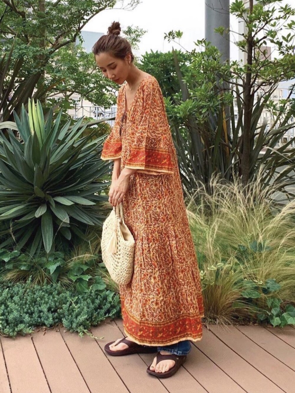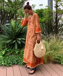 夏っぽい柄ワンピは羽織りとしても着られる2WAY✨ ブレードバッグとサンダルを合わせてエスニックな雰囲気に♪