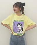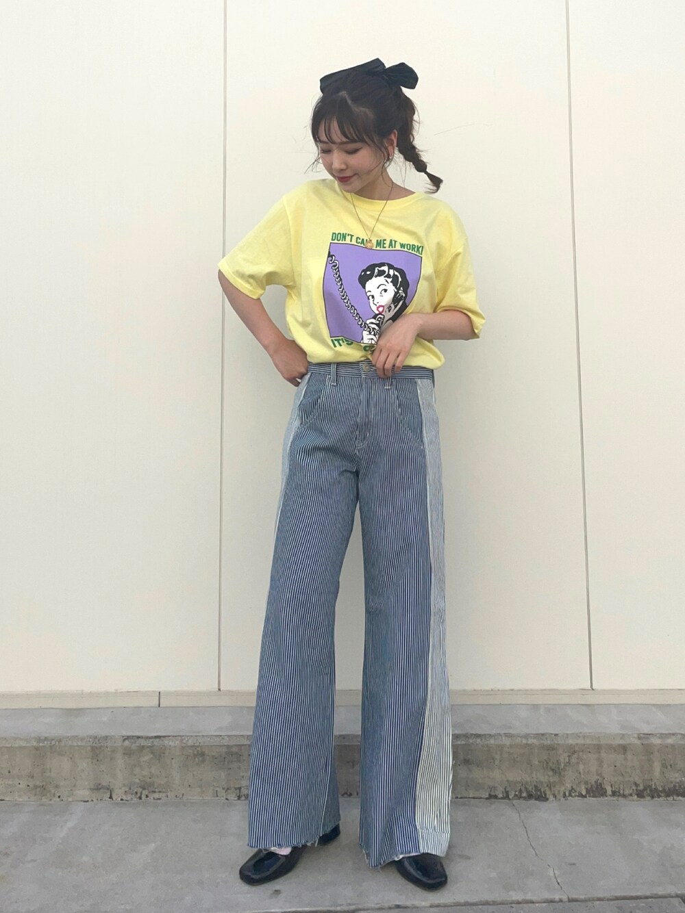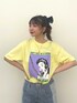 Tシャツのレトロポップなプリントに合わせて90'sなヘアアレンジに♡ リメイク風デニムは 縦ラインが強調されるデザインで脚長効果も👖✨